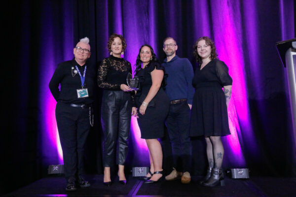 PHOTO: Ingrid Muschta, ODEN’s Director of Special Projects and Innovation (far left) and Chris Guillemette, Director of Support Services at Community Living North Bay and Vice-Chair of ODEN’s Board (far right), pose with the team from LiveWorkPlay. Julie Kingstone, Co-Leader and Director of Operations (second from left), holds their 2024 DES Award for Promising Practice and Innovation. She’s with Rebecca Coxon (Team Lead, Employment Ontario), Anna Nelson (Director of LiveWorkPlay Employment Supports) and Keenan Wellar (Co-Leader and Director of Communications).